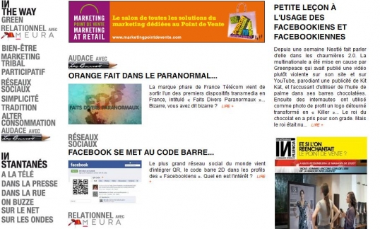 A surveiller de près les quatre grandes rubriques, IN… The Way pour les tendances de fond en marketing tribal, réseaux sociaux et alter consommation, IN…stantanés pour Les meilleurs cas de créativité media IN…novations pour les technologies de demain et même d’après demain et enfin IN…contournables pour voir, savoir et prévoir grâce aux contributions des professionnels les plus en vue. Un outil de veille indispensable pour toujours avoir une tendance d’avance.